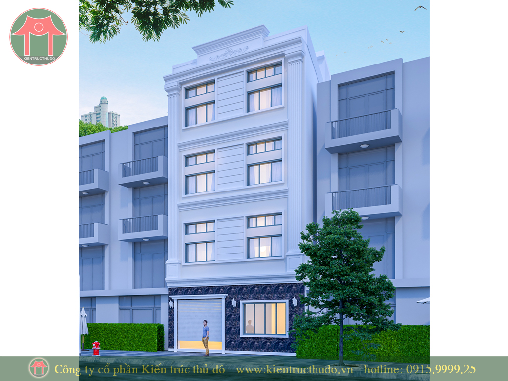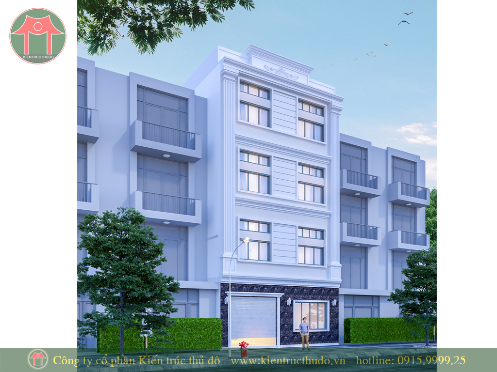 Phối cảnh góc công trình, công trình chúng tôi sử dụng gam màu trắng kết hợp khung nhôm đen, khối đế ốp đá, tạo cảm giác vững trãi cho ngôi nhà, cùng với đó là hoa văn họa tiết, minh họa theo lối kiến trúc tân cổ điển, tạo cảm giác sang trọng, thu hút mọi ánh nhìn, dù đứng bất cư nơi đâu, không góc cạnh, không điểm chết