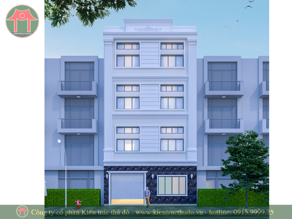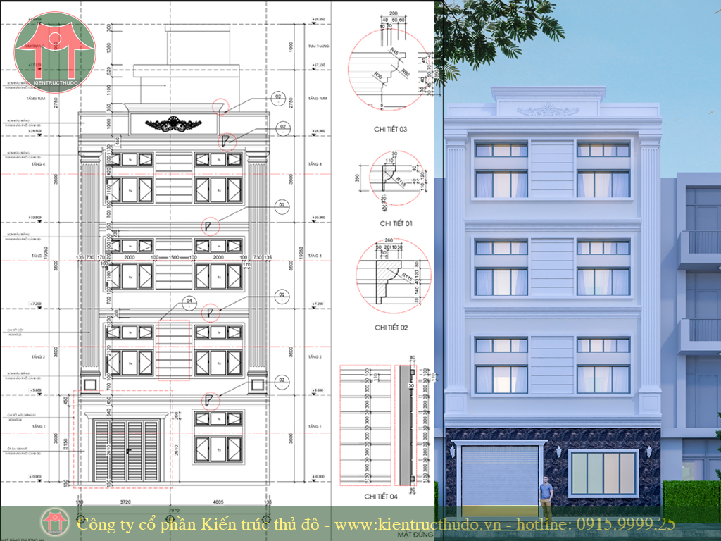 Mặt đứng chính công trình với lối thiết kế tân cổ điển nhẹ nhàng đầy sức mạnh, chi tiết kĩ thuật tỉ mỉ, hình ảnh 3D vật liệu rõ dàng, giúp chủ nhà kiểm soát tốt nhất về thẩm mỹ