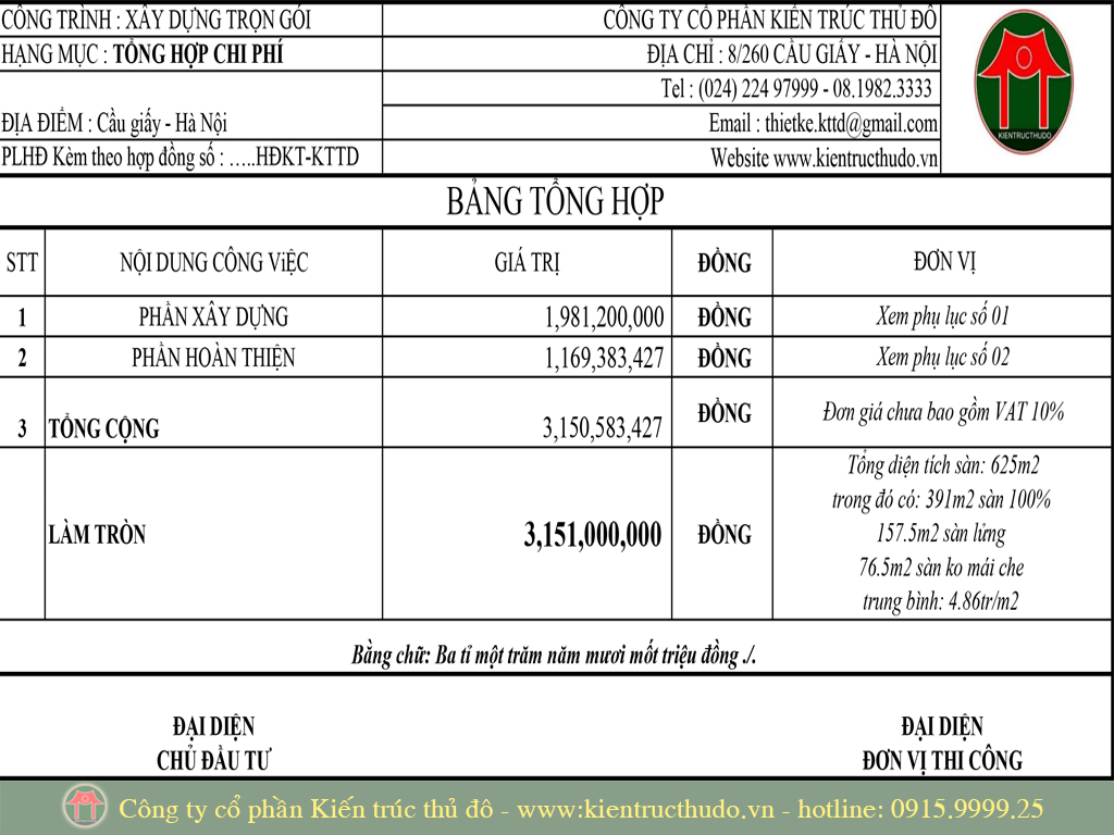 Chi phí xây dựng: 3.15 tỉ trọn gói chìa khóa trao tay (có dự toán chi tiết đính kèm)