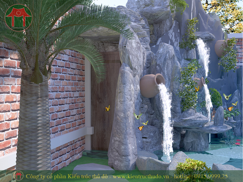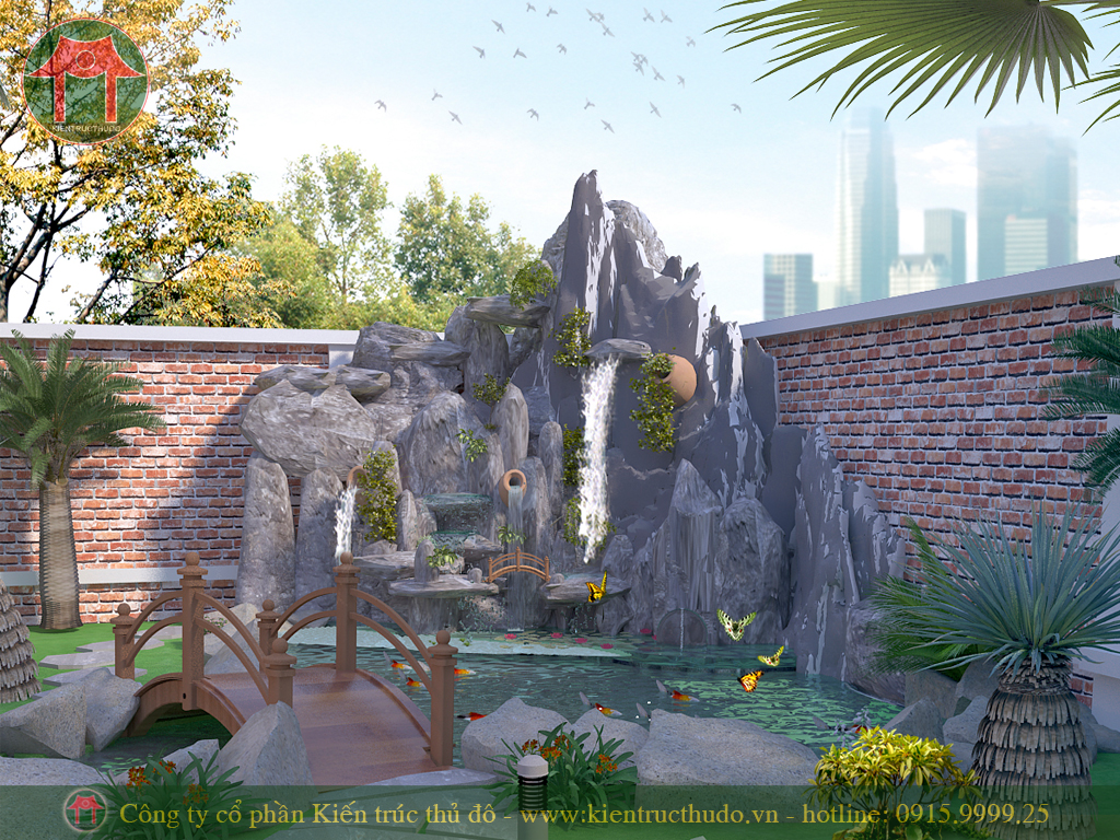 Phối cảnh góc sân vườn với cảnh quan đá non bộ được thiết kế sơn thủy hữu tình, núi thiết kế theo phong thủy đặt phía sau nhà, tạo cảm giác vững chắc cho căn hộ, phía trước với hồ cá coi tự nhiên, có cầu cảnh làm bằng gỗ thơ mộng, đây sẽ là nơi chụp ảnh lưu kỉ niệm mỗi khi có khách tới thăm.