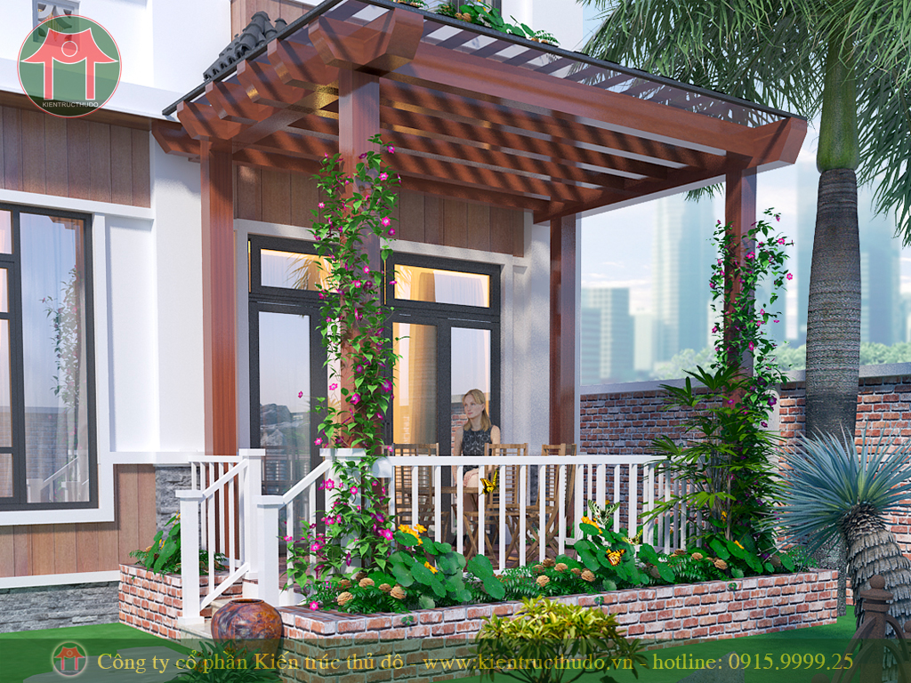 Phối cảnh góc sân vườn sảnh phụ với diện tích 11.5m2 có kết cấu bằng cột bê tông sơn giả gỗ, mái dùng mái kính cường lực 12mm xung quanh bọc thép không gì, thăng tuổi thọ công trình, tại đây chúng Tôi có bố trí bàn ăn cùng ổ điện cơ bản, đây sẽ là nơi đọc sách ngắm hồ cá coi vô cùng lý tưởng của gia chủ..