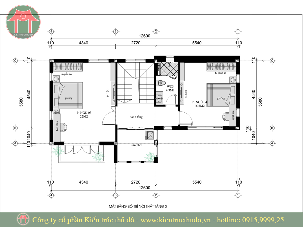 Mặt bằng tầng 3 được bố trí 02 phòng ngủ và vệ sinh chung, đối diện cầu thang là khu giặt phơi, lưu ý, với việc Anh Hiển có phòng thờ tại nhà cổ, nên tại đây sẽ không bố trí phòng thờ, nếu bạn đọc đến đây, bạn muốn có phòng thờ thì có thể biến phòng ngủ phía trước (trên phòng khách) làm phòng thờ bạn nhé
