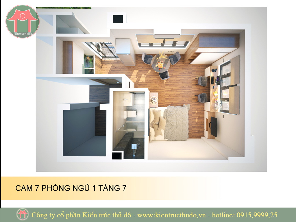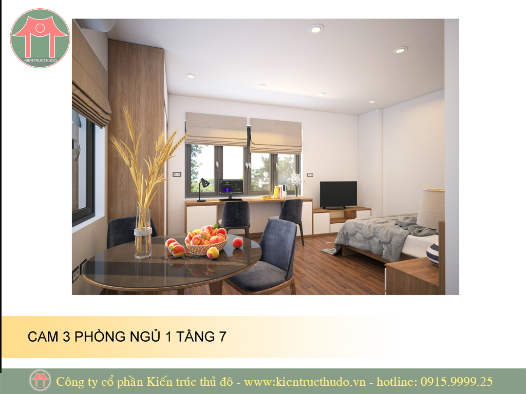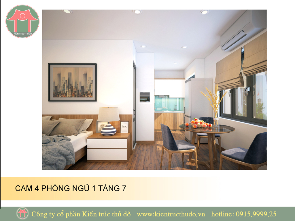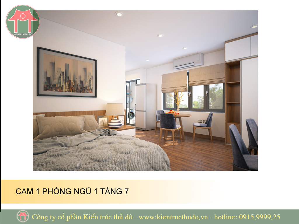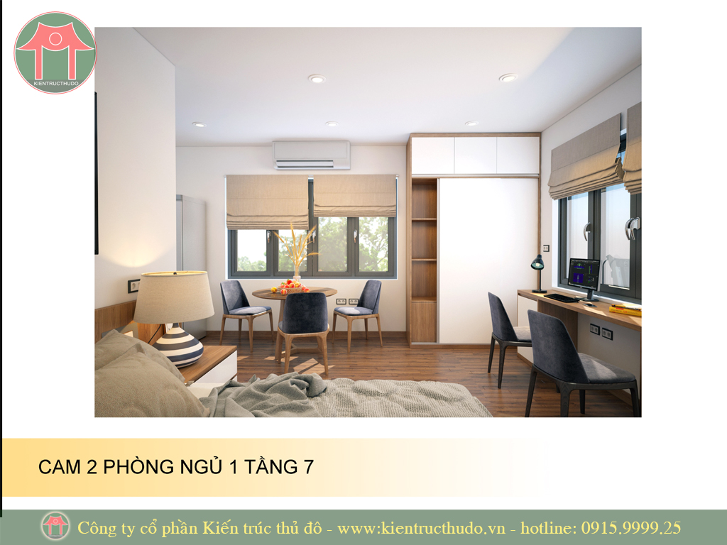 góc camera 02 - thể hiên toàn cảnh không gian nghỉ, kết hợp tủ quần áo và bàn học - nhẹ nhàng và tinh tế