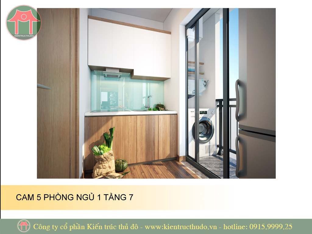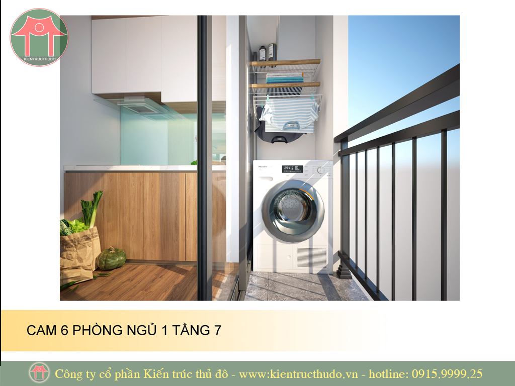 góc camera06 - vị trí giặt và phơi - thiết kê vô cùng đơn giản, ngăn cách nhà bếp bằng hệ cửa trượt 2 cánh, phía ngoài có lan can bảo vệ, khung thép sơn tĩnh điện, nơi đây tập chung hệ kĩ thuật và bố trí cục nóng điều hòa