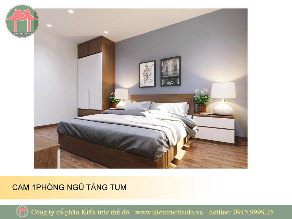 Phối cảnh phòng ngủ chủ nhà, thiết kế nhẹ nhàng, vật liệu chủ yếu cùng tone màu với toàn nhà