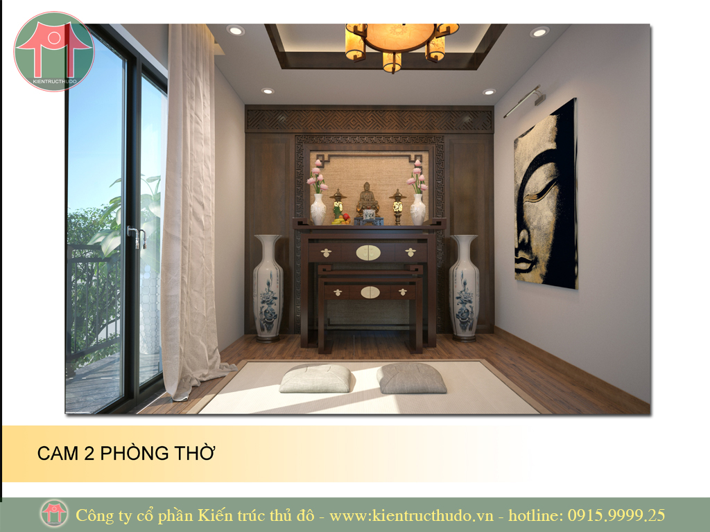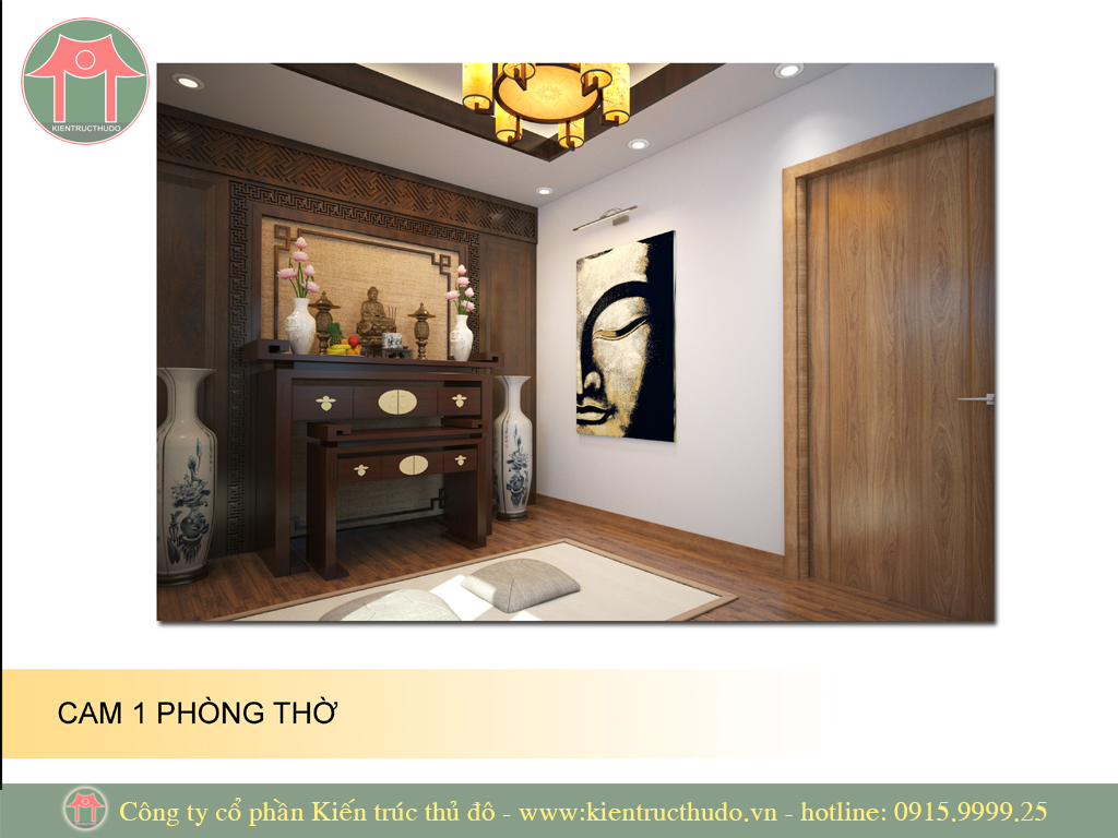 góc camera01 - hướng chính ban thờ - phòng thờ được chúng tôi sử dụng gam màu tối, vật liệu chủ yếu là gỗ gụ, sơn PU đậm, có họa tiết CNC làm điểm nhấn, ánh sáng dùng sáng vàng ấm, giúp gia chủ có không gian phòng thờ rất ấm cúng