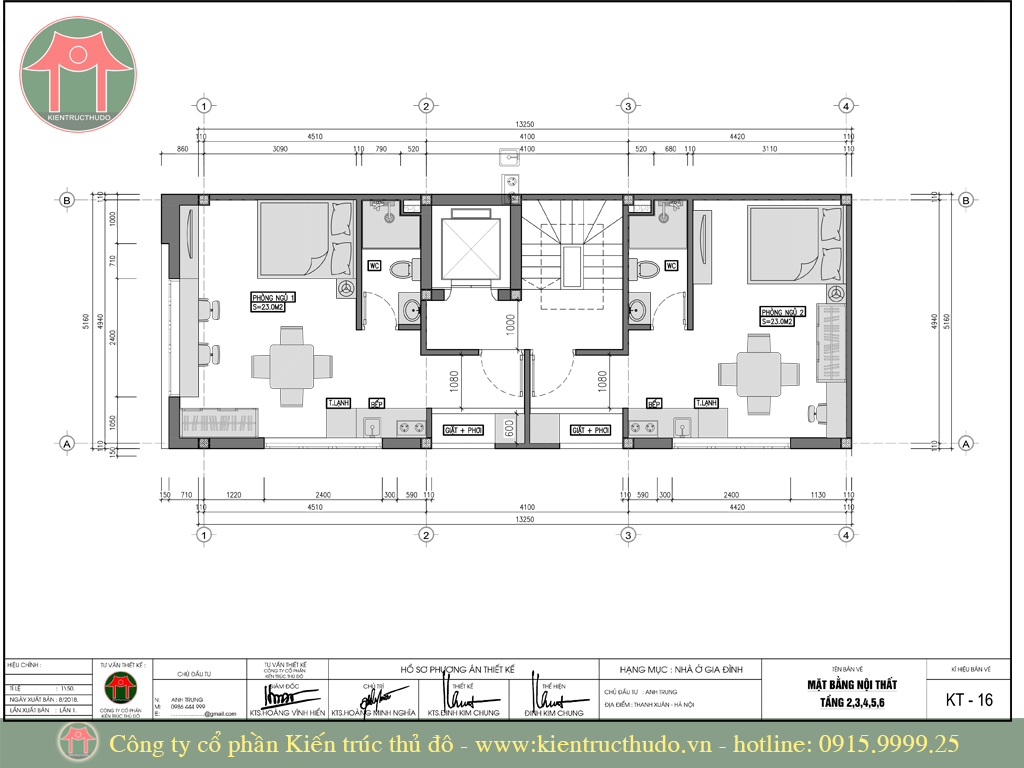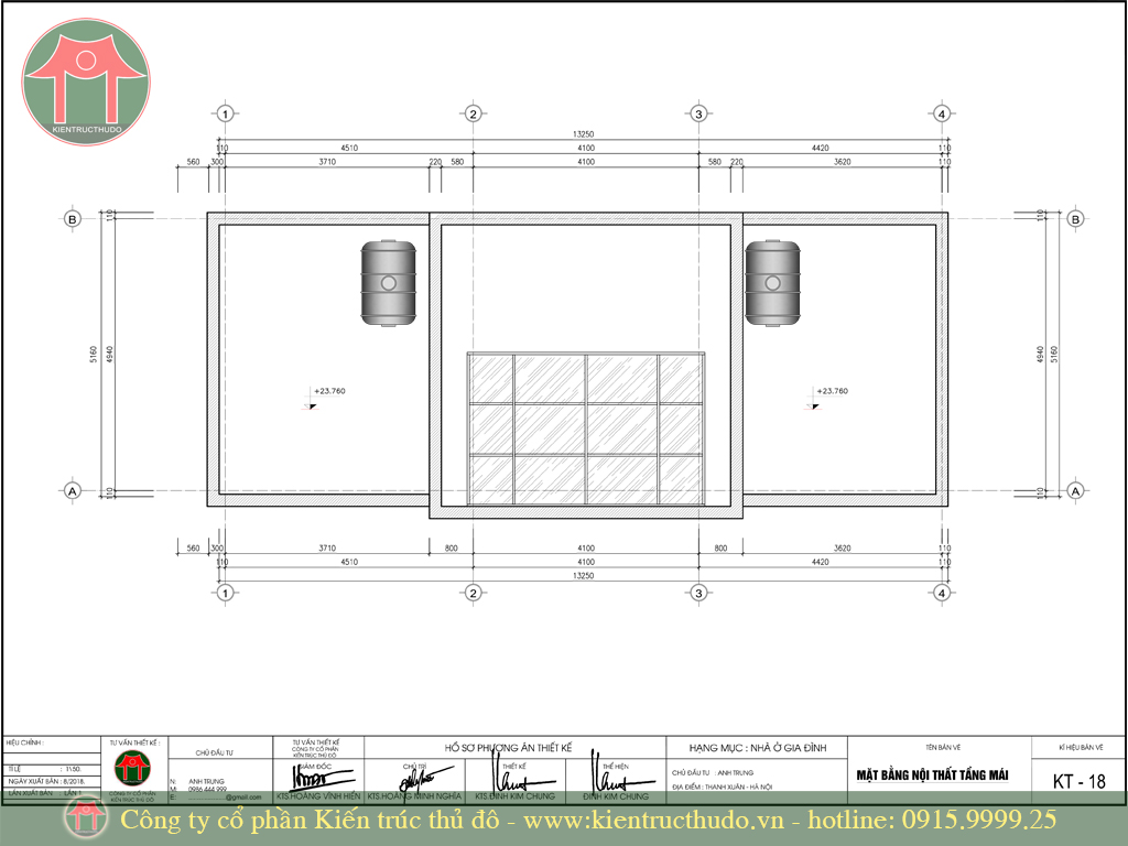 Mặt bằng mái, nơi để ô thông tầng, bố trí 02 téc nước mái dọc trục vệ sinh cho từng căn hộ