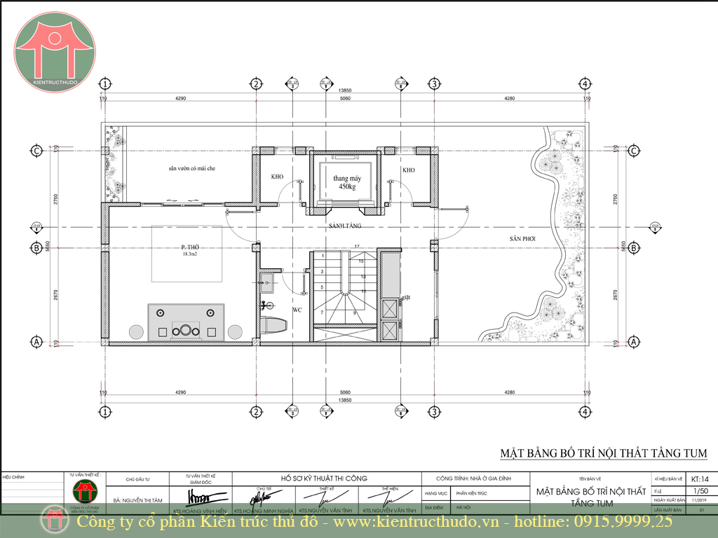 Mặt bằng tầng tum, nơi chủ nhà hướng về nguồi cội, nơi có phòng thờ 18m2 hướng nhìn ra logia với khoảng xanh bất tận, một nơi ấm cúng và vô cùng linh thiêng