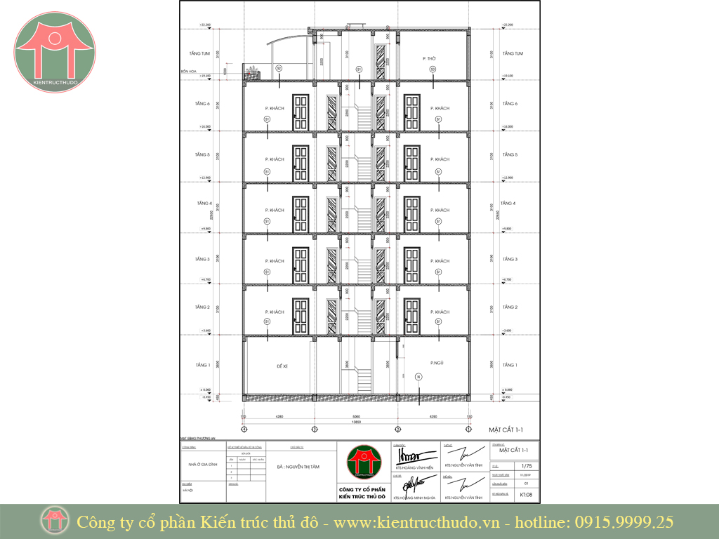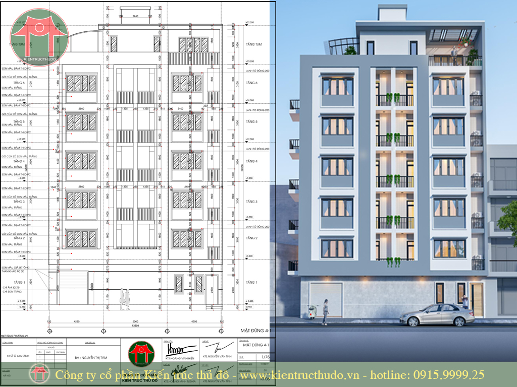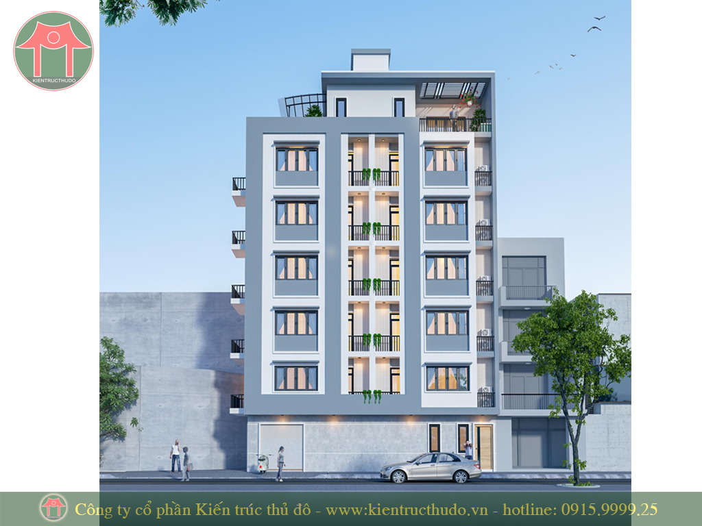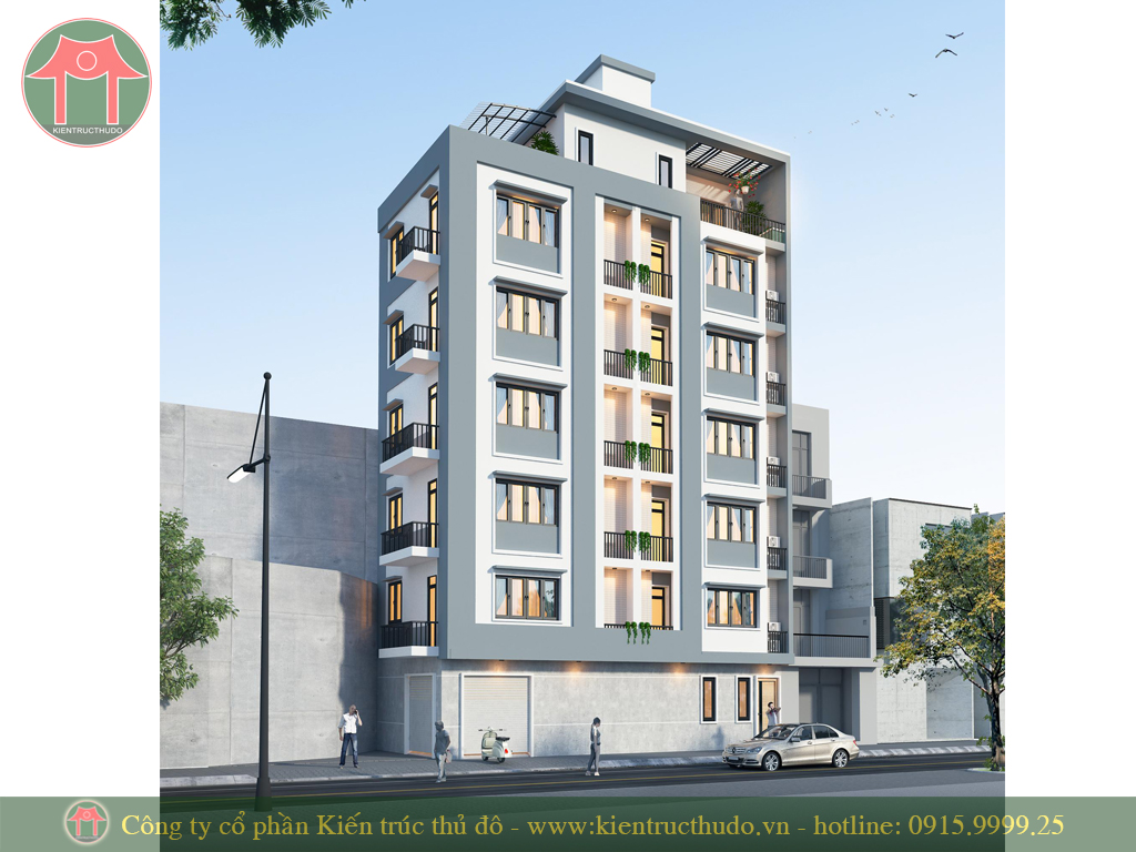 Công trình thiết kế với 02 mặt ngõ, ngõ rộng trung bình 3m, ngôn ngữ thiết kế hiện đại, gam màu trẻ, năng động, mảng khối rõ dàng và liền mạch, các khoảng đặc của tường, kết hợp khoảng lồi lõm của ban công và lô gia tạo nên tổng thể kiến trúc hài hòa cho căn hộ, Tầng 1 được sơn tường giả đá cao cấp, tạo bề thế cho công trình, từ tầng 2-3-4-5-6 có bố trí cửa sổ khung nhôm kính, kết hợp các mảng tường xanh đan xen trắng, tạo điểm nhấn công trình, vừa là nơi bố trí hệ thống kĩ thuật điều hòa, vừa là nơi bố trí khoảng bếp cũng như sân phơi quần áo cho căn hộ