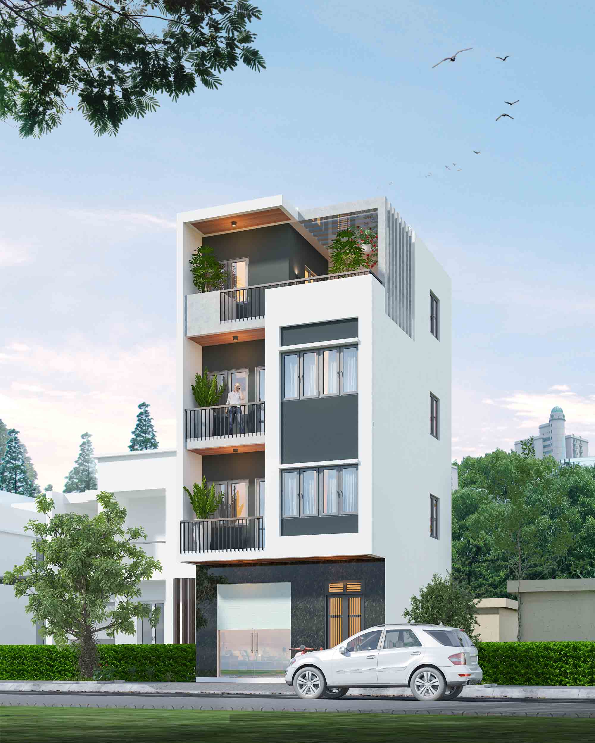 Thiết kế nhà hiện đại không thể thiếu những khoảng xanh, chúng Tôi có bố trí trồng cây suốt mặt đứng công trình, từ tầng 2 phòng ngủ master đến tầng tum sân vườn, các khoảng ban công được trang trí bằng cây xanh, đây cũng là điểm nhấn giúp công trình trở nên hiện đại và thân thiên với môi trường.