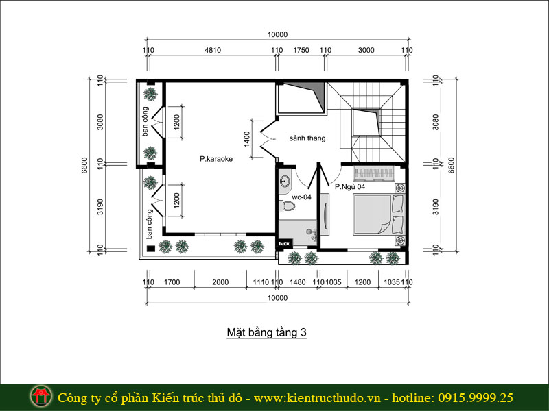 Mặt bằng tầng 3 thiết kế với phòng ngủ cùng phòng karaoke