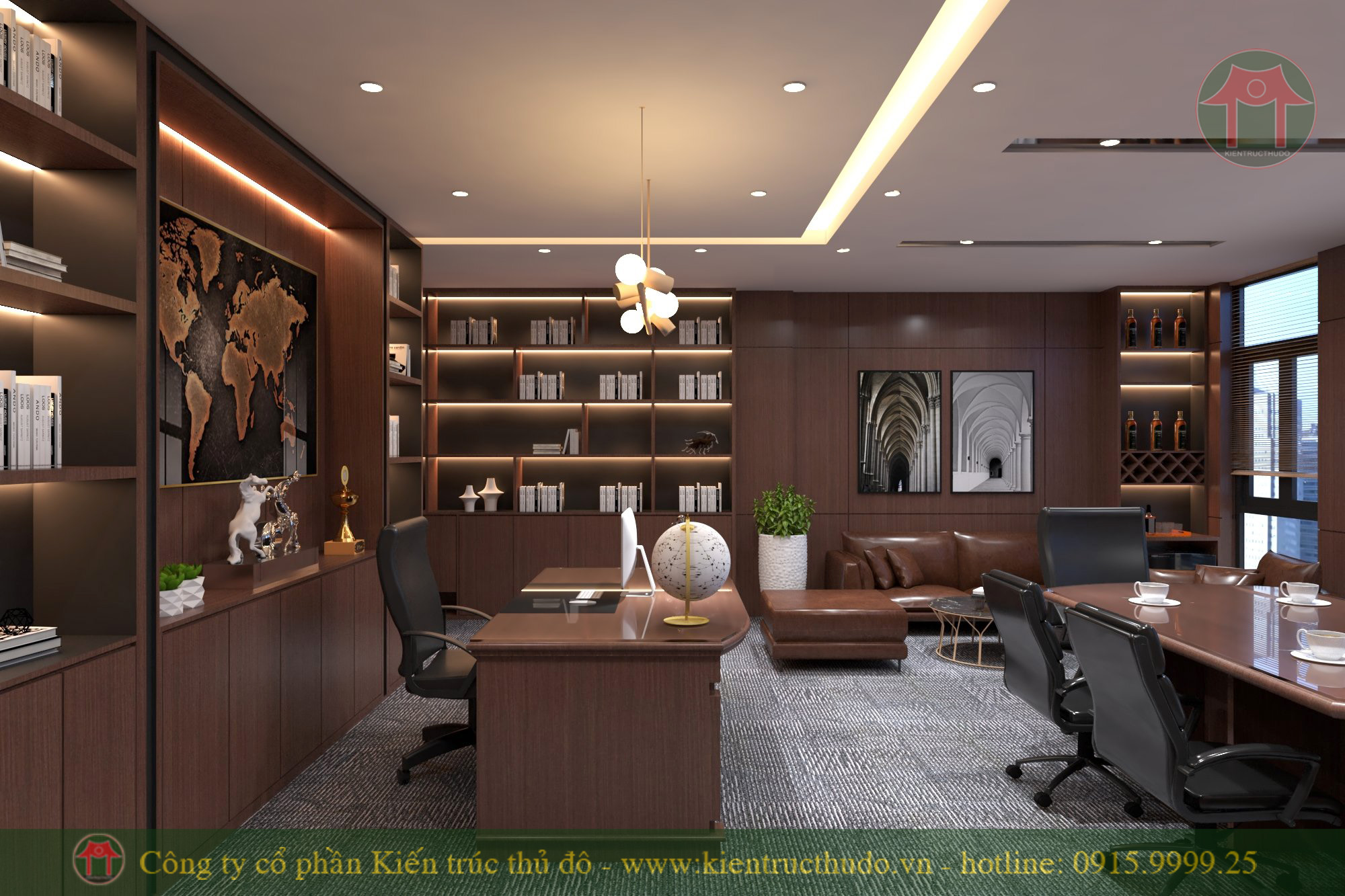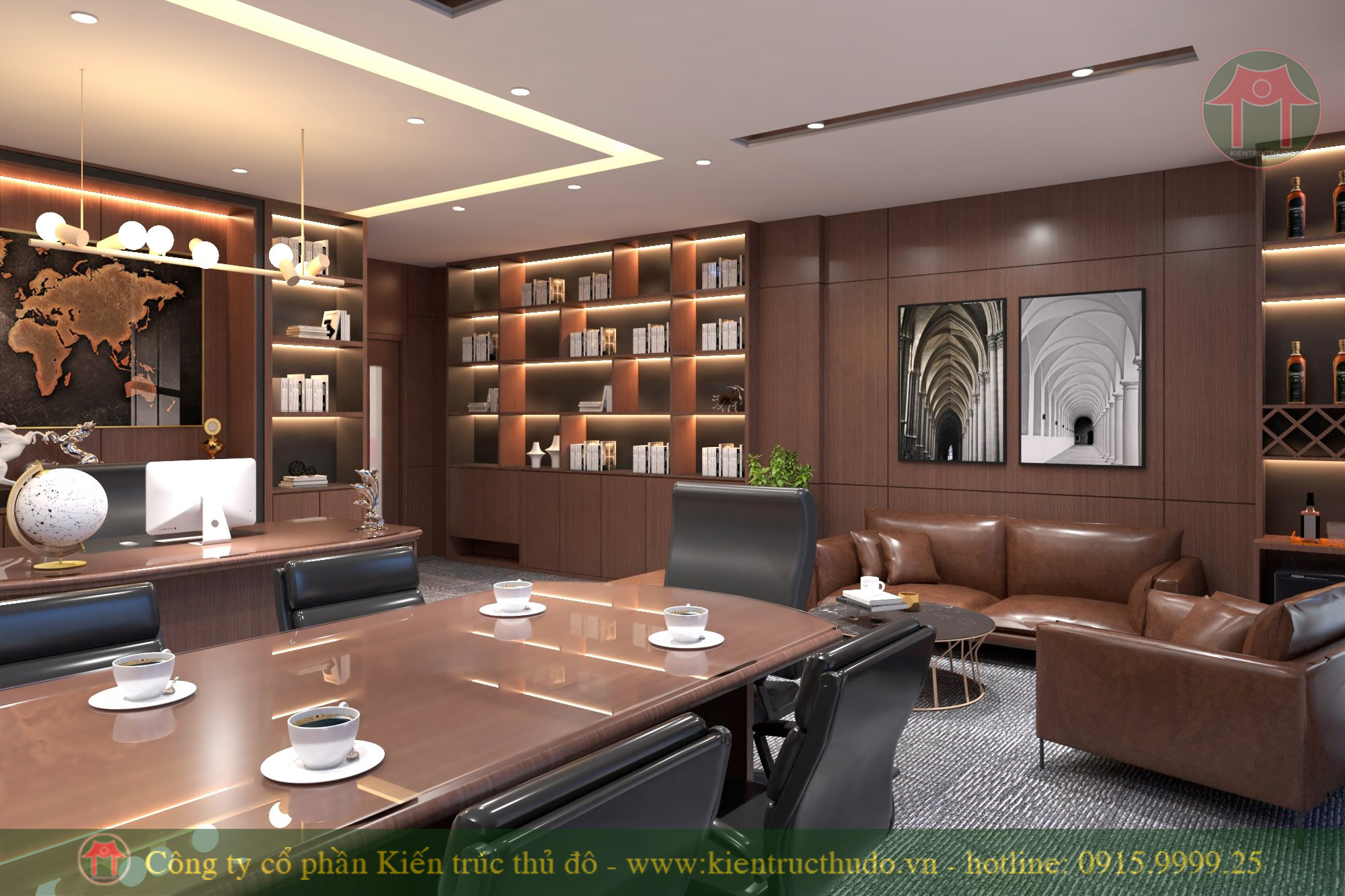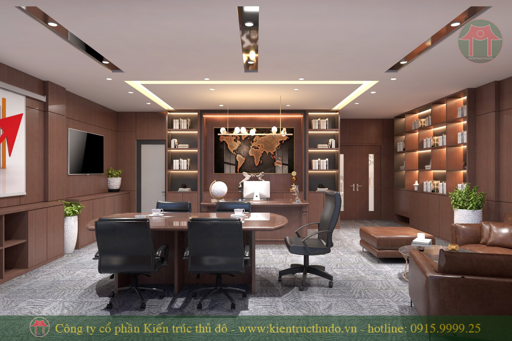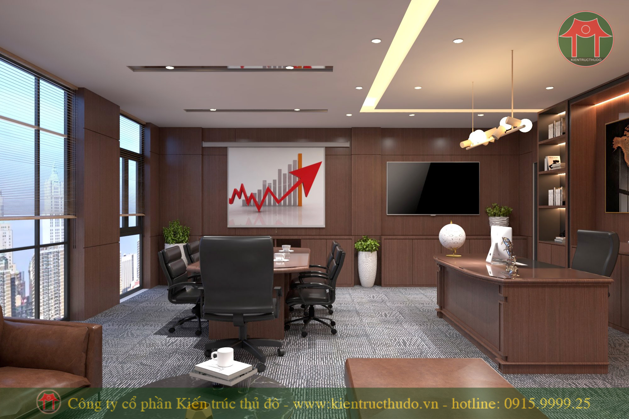 Phòng giám đốc với diện tích 60m2 bố trí gồm có vệ sinh sinh khép kín, bàn làm việc giám đốc, sofa đón khách và phòng họp nội bộ dành cho các nhân sự cao cấp