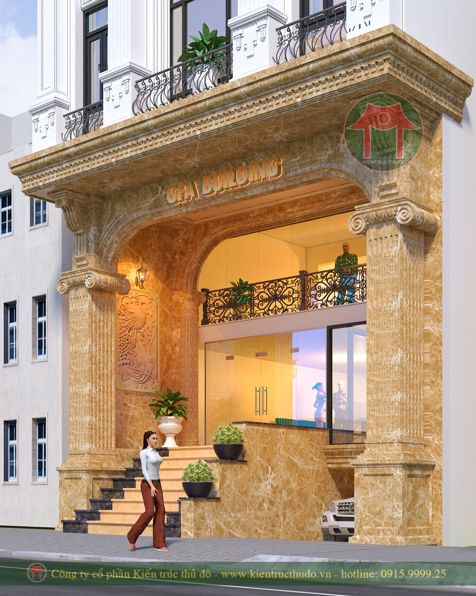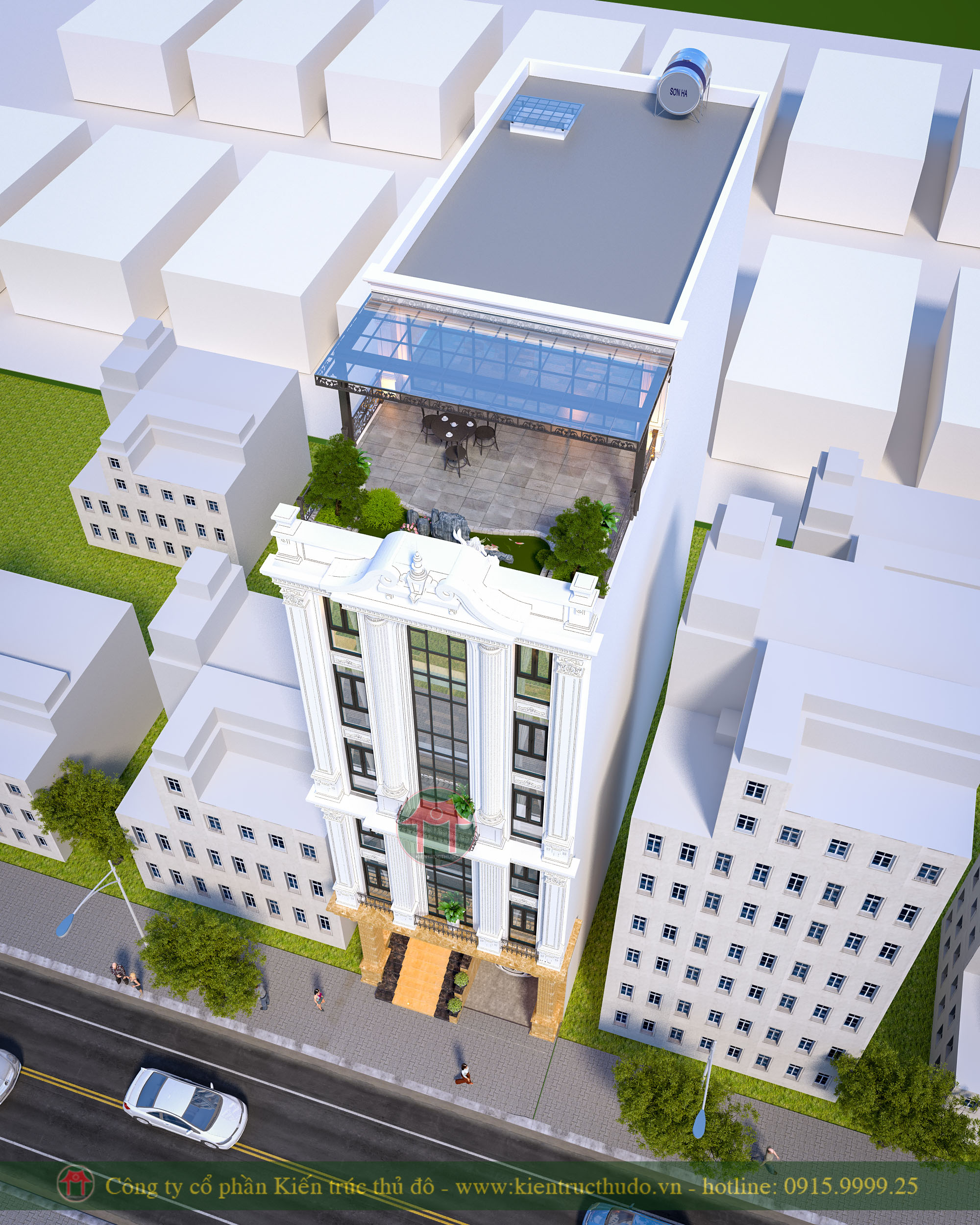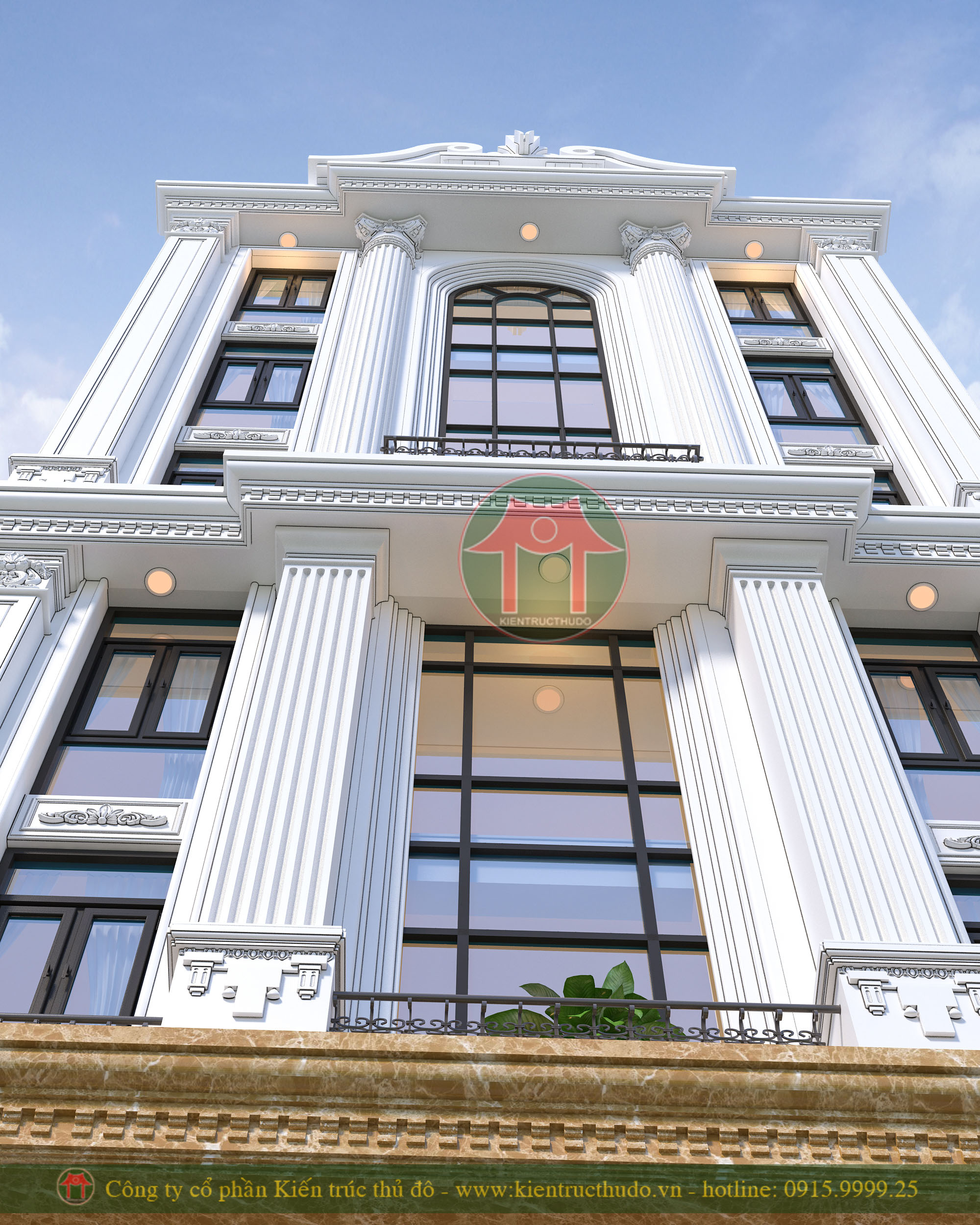 Phần kết thúc mái được thiết kế dạng mái tân cổ diển, hoa văn nhẹ nhàng, tỉ lệ hài hòa cân đối, phía trên có thiết kế hệ mái khung thép, giúp tầng tum thông thoáng, và theo đúng luật cùa thành phố;