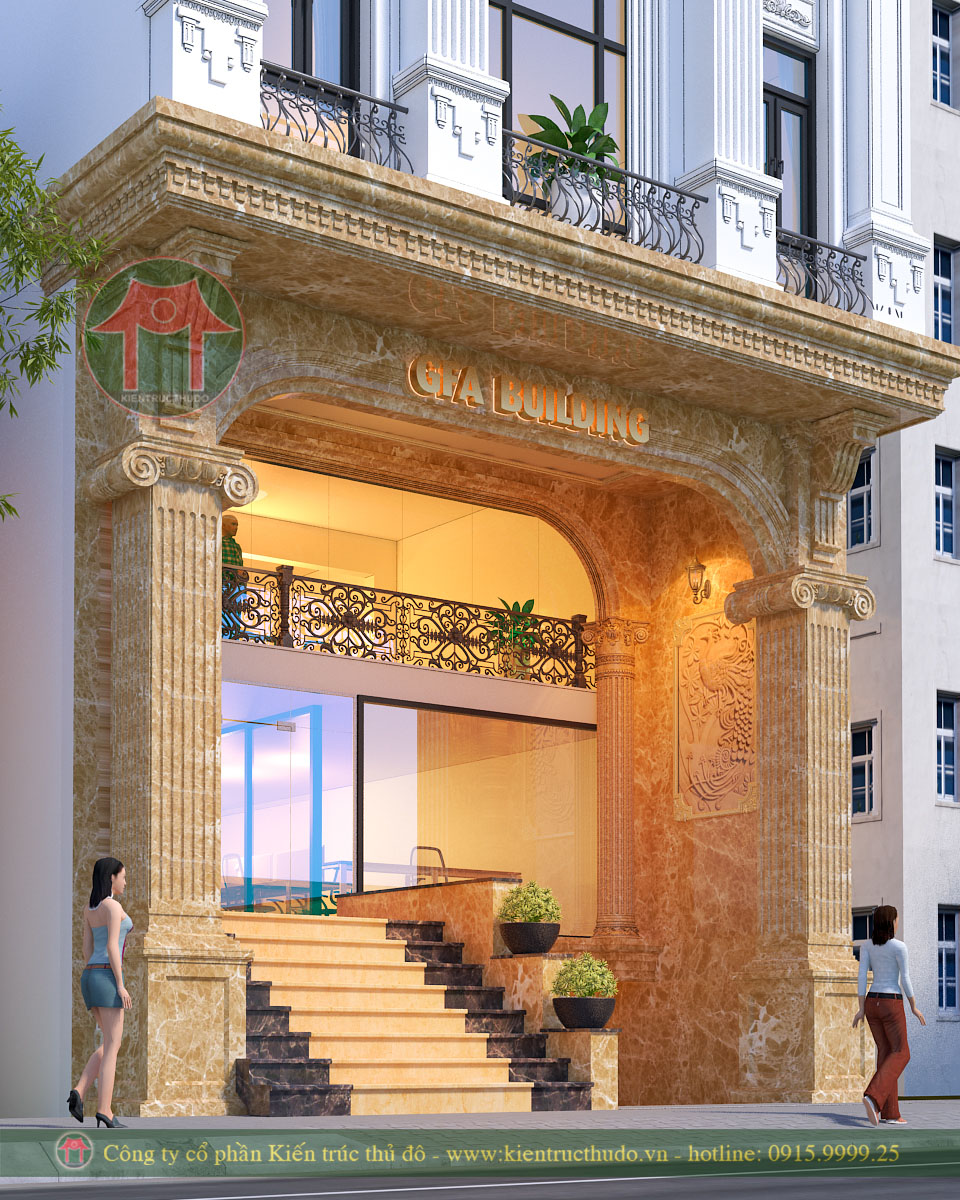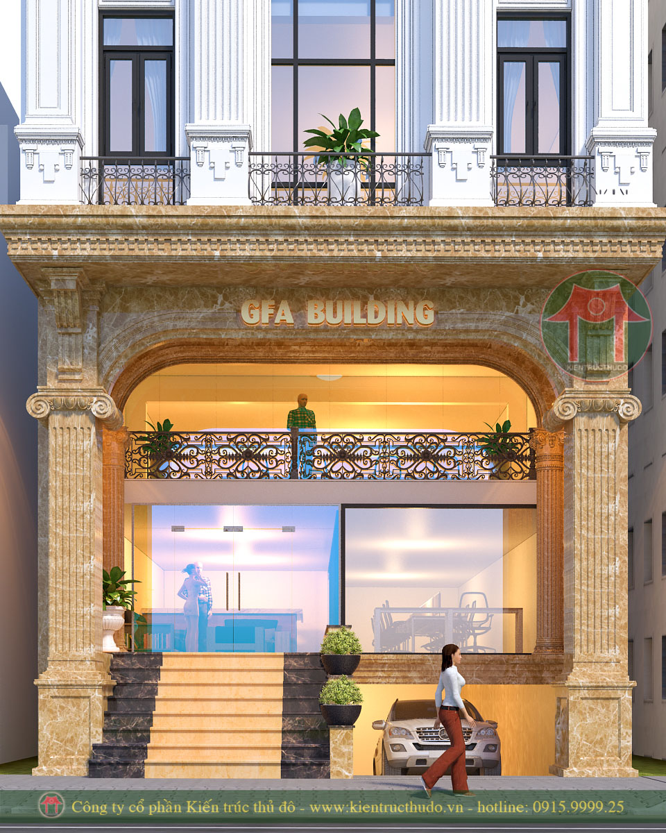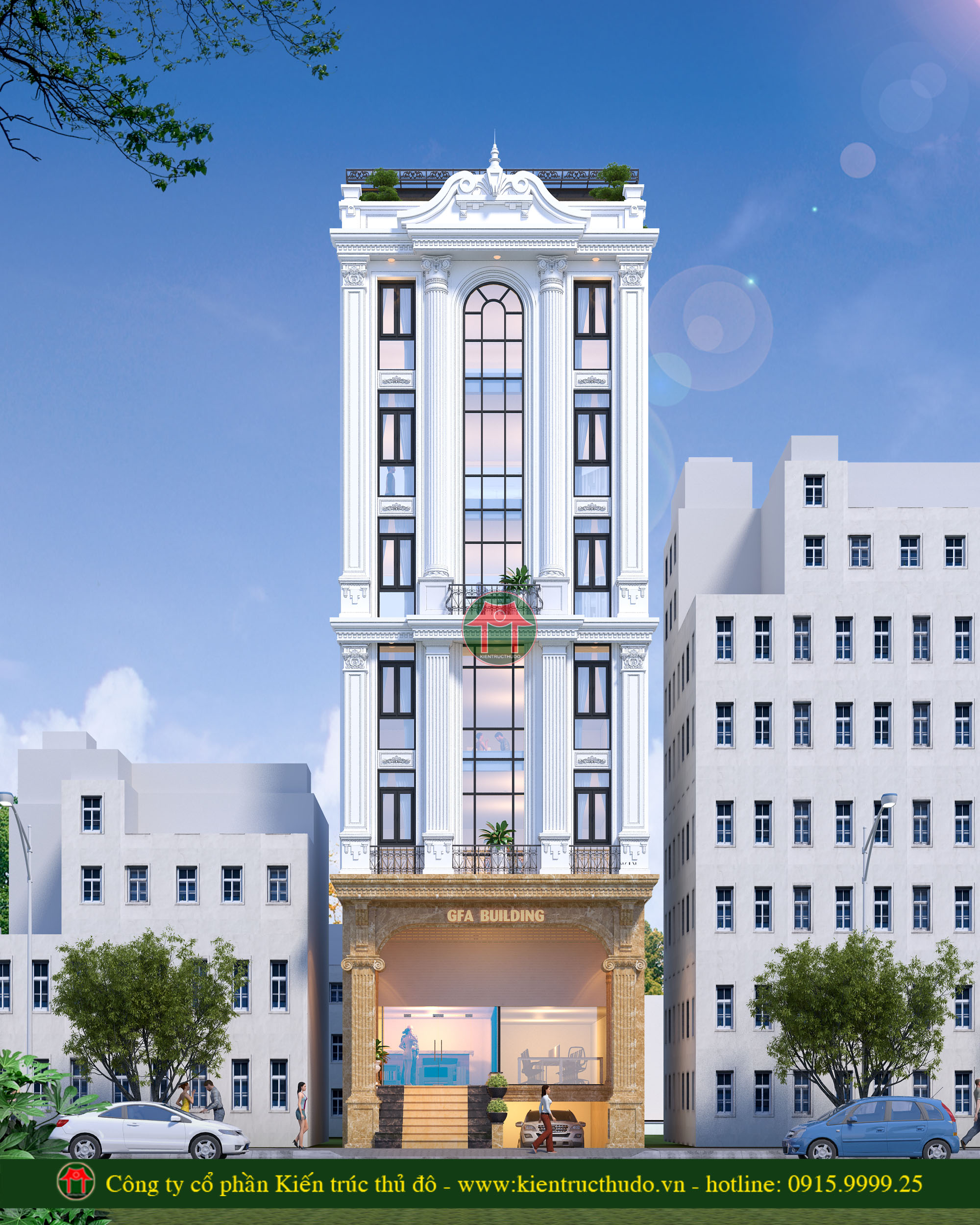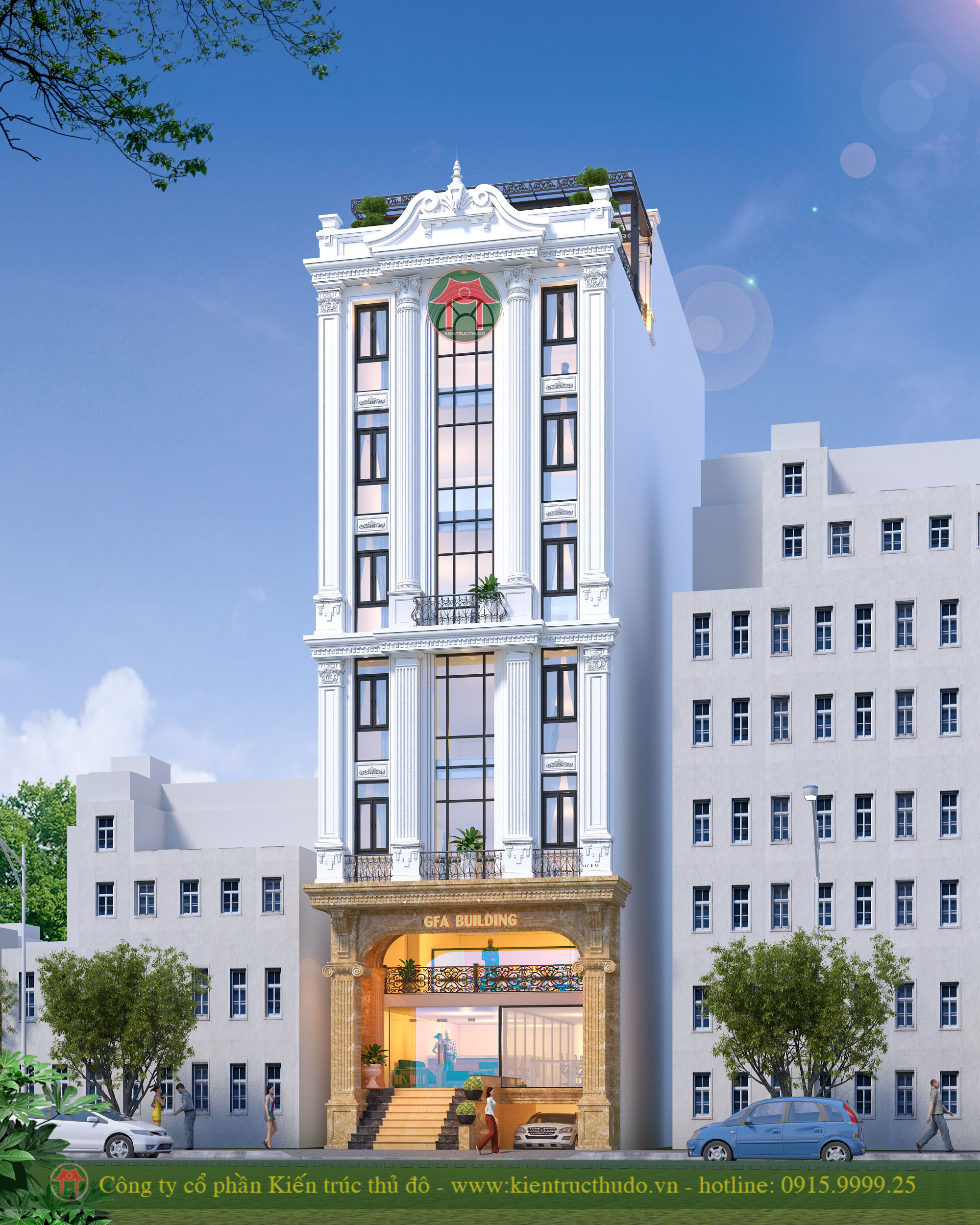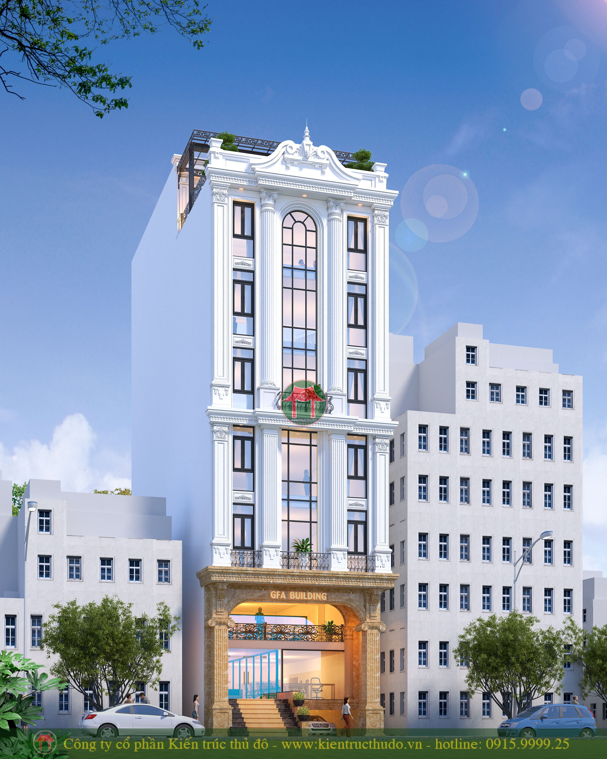 Ngoại thất thiết kế văn phòng với ngôn ngữ tân cổ điển, màu sắc chủ đạo là màu trắng